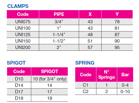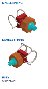 Queste fascette ad attacco rapido possono essere montate senza l’utilizzo di attrezzi e garantiscono un buon livello di adattabilità al tubo, grazie al sistema singola molla (per pressioni fino a 4bar) o doppia molla (fino a 10bar). Il corpo è dotato di codolo di vari diametri per adattarsi ad un ampio range di situazioni. Dispone inoltre di un alloggiamento per le sfere UNISFE. Compatibile anche con ugelli a sfera DPL. Completa il sistema la ghiera di serraggio UNINPL001.