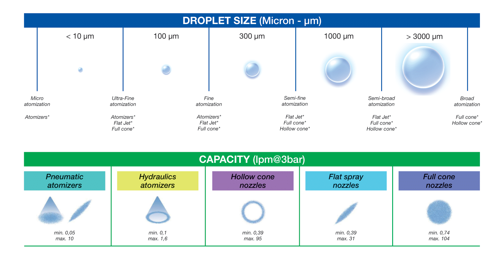 We can obtain the smallest droplets with air atomizing atomizers and the largest ones with full cone nozzles. The following table shows the droplet diameter average; for each spray pattern, the minimum and maximum flow rate values at 3-bar pressure.