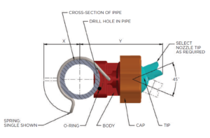 - Permits directional adjustment of the nozzle tip anywhere within a 45° included angle.