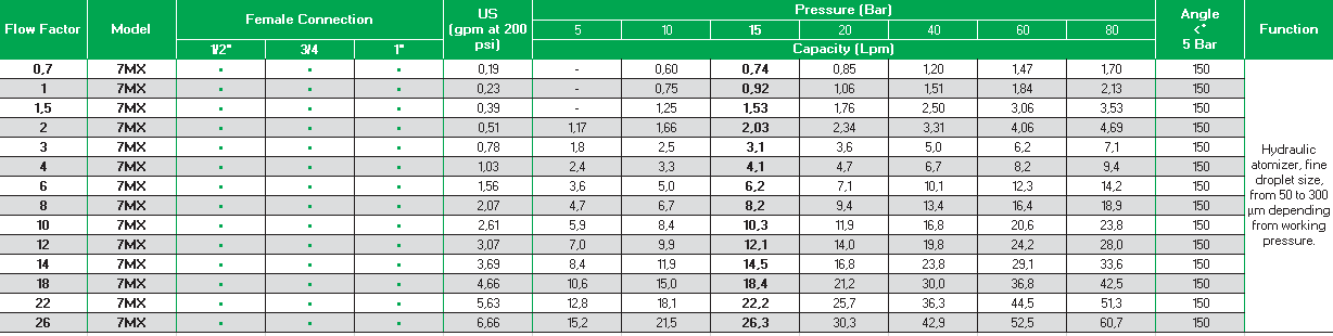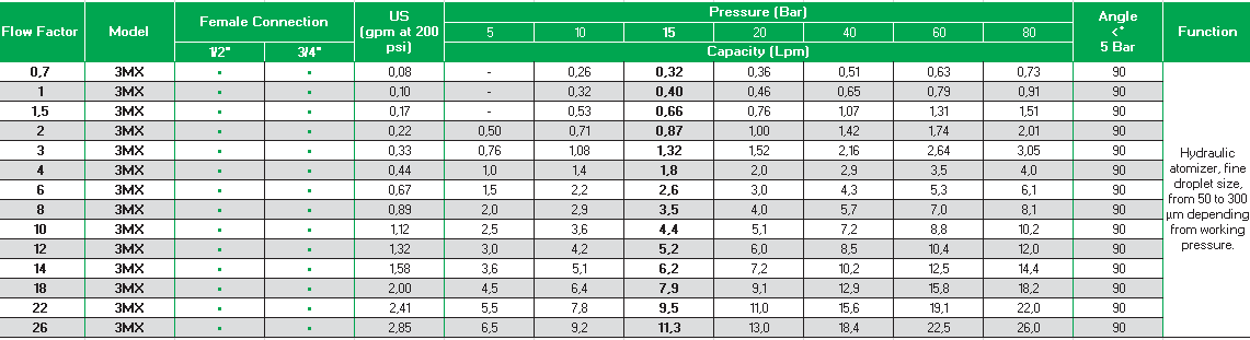 La serie MX contempla el uso de pulverizadores hidráulicos. En la versión 7MX lleva siete pulverizadores con un amplio ángulo de cobertura, alrededor de 150°, la versión 3MX lleva solamente tres pulverizadores con un ángulo de cobertura alrededor de 90°.