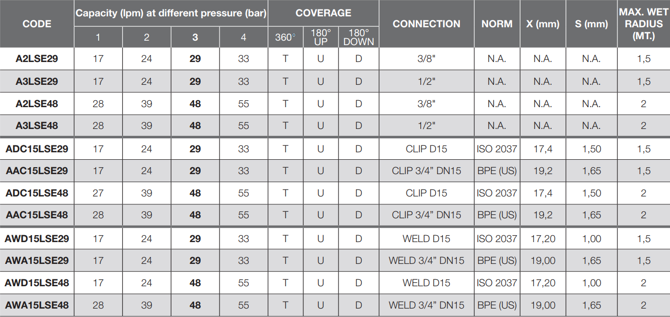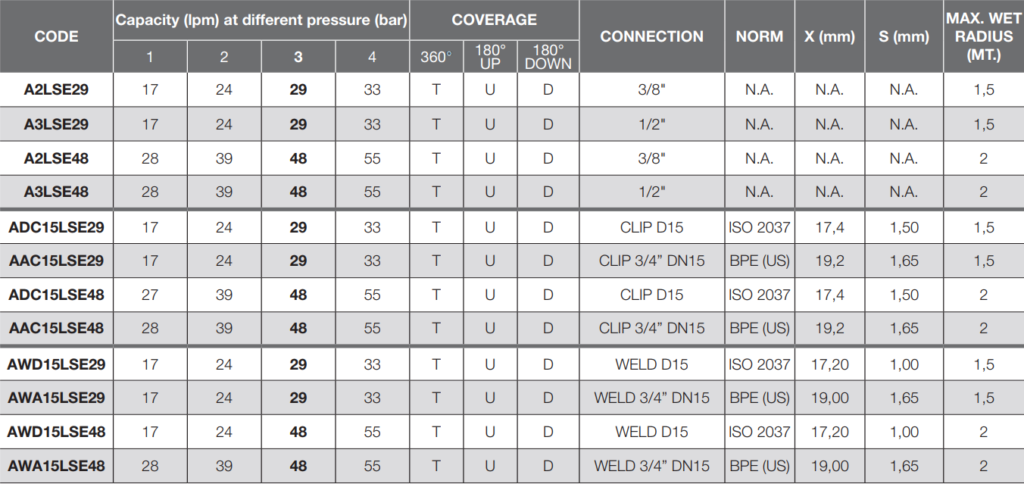 Las boquillas rotativas LSE están fabricadas en acero inoxidable AISI 316L y están montadas en una doble hilera de bolas para tener una correcta rotación en cualquier posición de montaje.