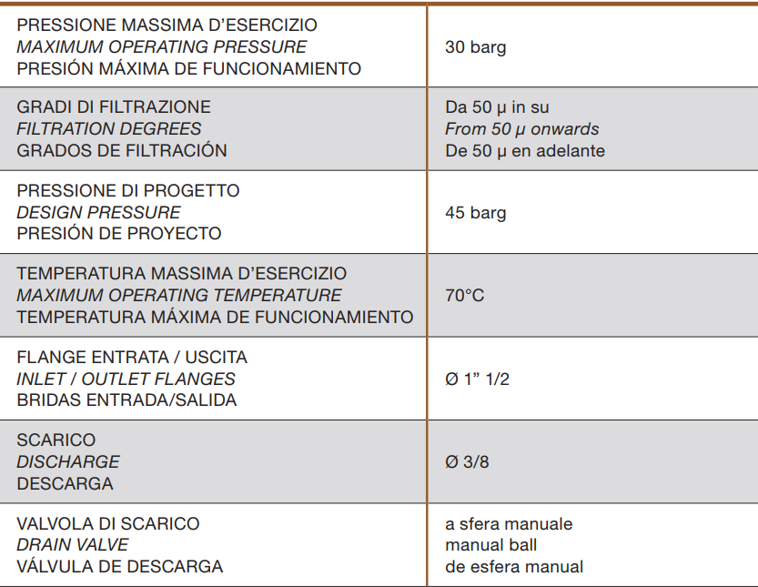 Valori di portata max in m3/h con acqua pulita e perdita di carico di 0,2/0,3 barg, con differenti gradi di ritenzione.