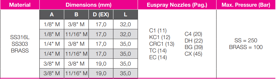 Lug212022 MCORPO Related PDFsMaterial SS316L ,SS303, BRASS Dimensions 1/8″ M , 3/8″ M, 11/16″M , 1/4″ M Technical specifcations Click on the table to enlarge it 21 de Luglio de 2022 Share this post Condividi su FacebookCondividi su Facebook TweetCondividi su Twitter Pin itCondividi su Pinterest Condividi su LinkedInCondividi su LinkedIn Naviga tra i postPrecedentePost precedente:GHIERE A BAIONETTA IN PLASTICA – PGHIERAASuccessivoProssimo post:CORPO FEMMINA PER UGELLI- FCORPORelated postsSISTEMI DI UMIDIFICAZIONE – RH CONTROL29 de Luglio de 2022SERBATOI PRESSURIZZATI CARRELLATI- ITANK – FTANK22 de Luglio de 2022SERBATOI PRESSURIZZATI – SERBJ22 de Luglio de 2022EIETTORI UNIEDU-AMEDU22 de Luglio de 2022ACCOPPIATORI RAPIDI – UNIFFA22 de Luglio de 2022GHIERA DI SERRAGGIO PER UGELLI E SFERE – NPL22 de Luglio de 2022